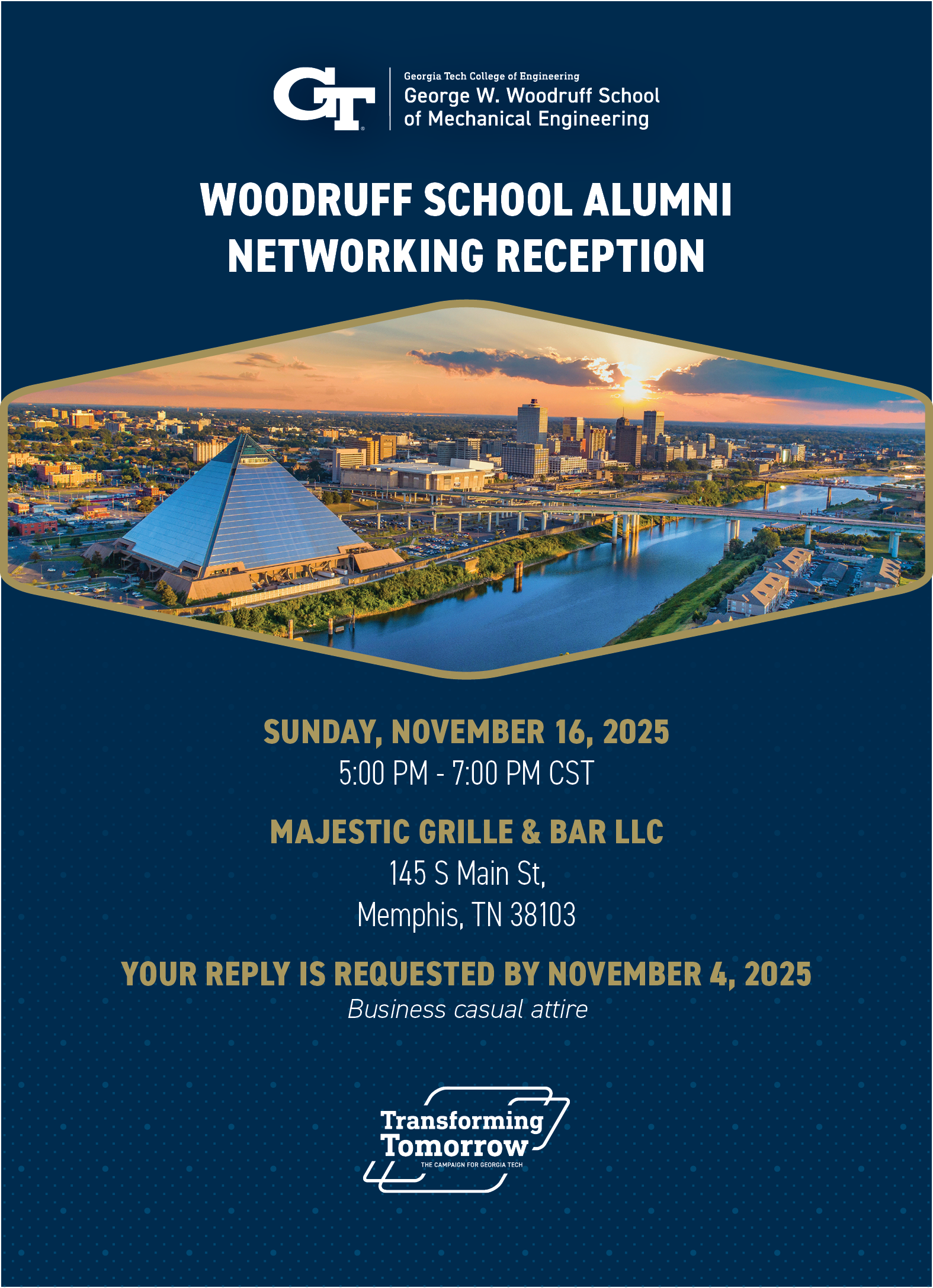 Join us for an evening of networking, celebration and collaboration... If you’re local to the Memphis area or in town for ASME's International Mechanical Engineering Congress & Exposition, we’d love for you to join us for the Woodruff School Alumni Networking Reception. Come reconnect with fellow ME and NRE/MP alumni, expand your professional network, and celebrate the impact of our Woodruff School community.